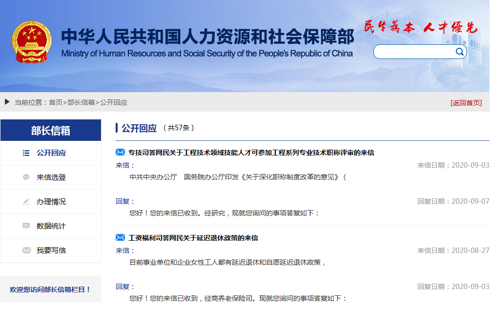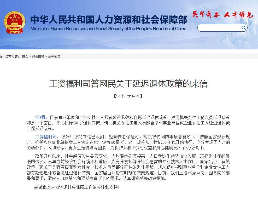9月3日,人力資源與社會保障部官網(wǎng)“部長信箱”欄目發(fā)布了一則“工資福利司答網(wǎng)民關(guān)于延遲退休政策的來信”。