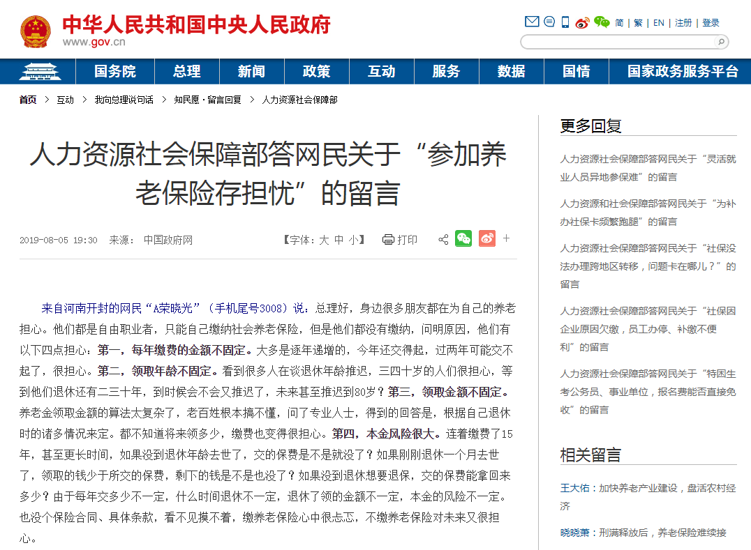 2019年8月5日,人力資源社會保障部在答中國政府網(wǎng)網(wǎng)民關(guān)于“參加養(yǎng)老保險存擔(dān)憂”的留言中表示: