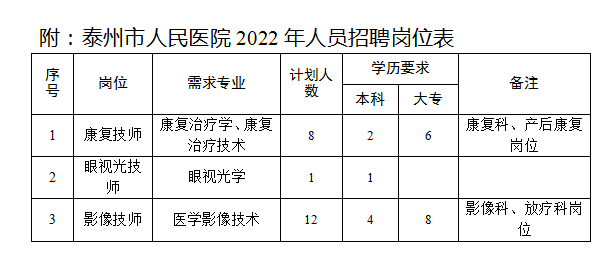 為做好2022年人員招聘考試工作,泰州市人民醫(yī)院決定招聘合同制工作人員21名?,F(xiàn)將有關(guān)事項(xiàng)公告如下: