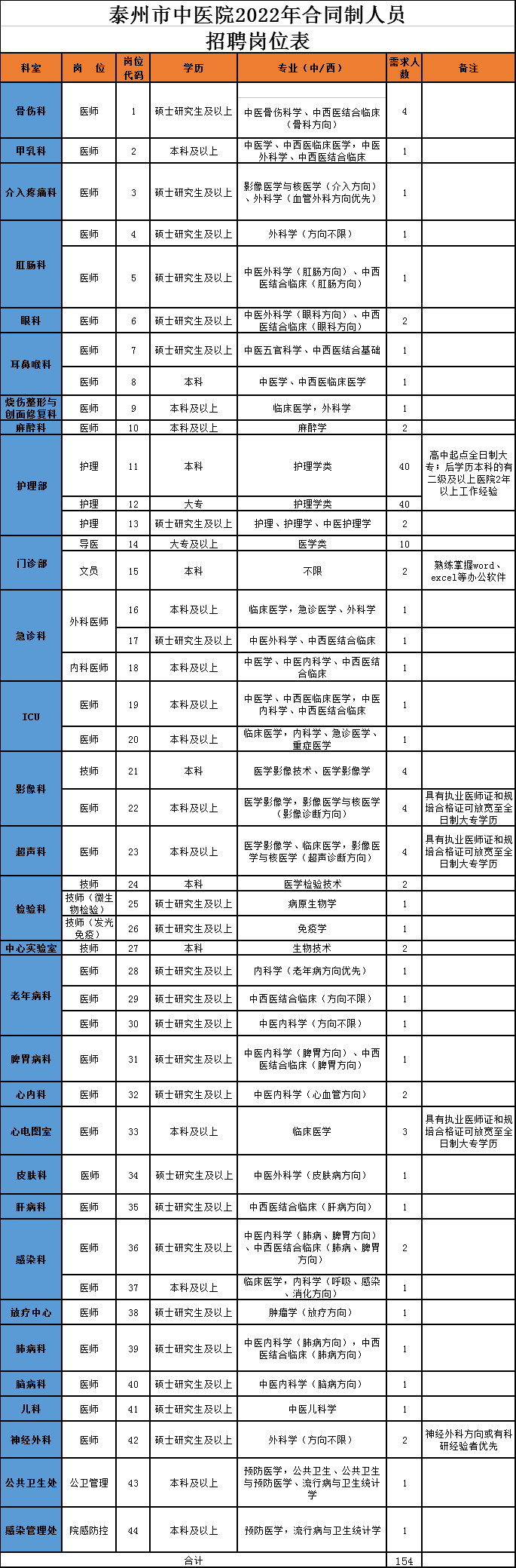 泰州市中醫(yī)院是泰州市衛(wèi)生健康委員會直屬差額撥款事業(yè)單位,2022年計劃招聘154名合同制人員,具體崗位、專業(yè)、學(xué)歷等要求詳見《泰州市中醫(yī)院2022年合同制人員招聘崗位表》(見下表)。