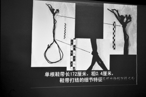 通報方:自縊工具為死者所穿鞋上的鞋帶,死者穿一雙黑色高幫旅游鞋,鞋帶呈柱狀,每根長172厘米,直徑0.4厘米。