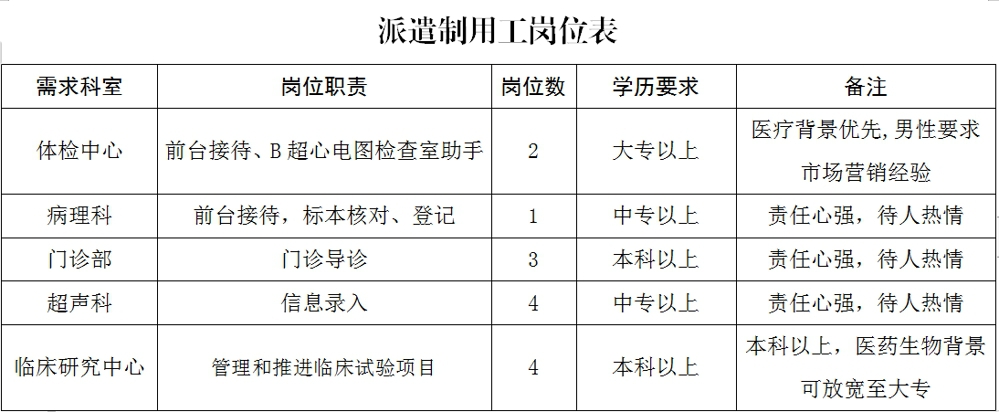 因我院業(yè)務(wù)上升,人員需求增加,現(xiàn)急需招聘體檢中心、門診部、醫(yī)療輔助科室及臨床研究項目派遣制用工14名(具體見附件“派遣制用工崗位表”,以下簡稱“崗位表”),條件要求如下: