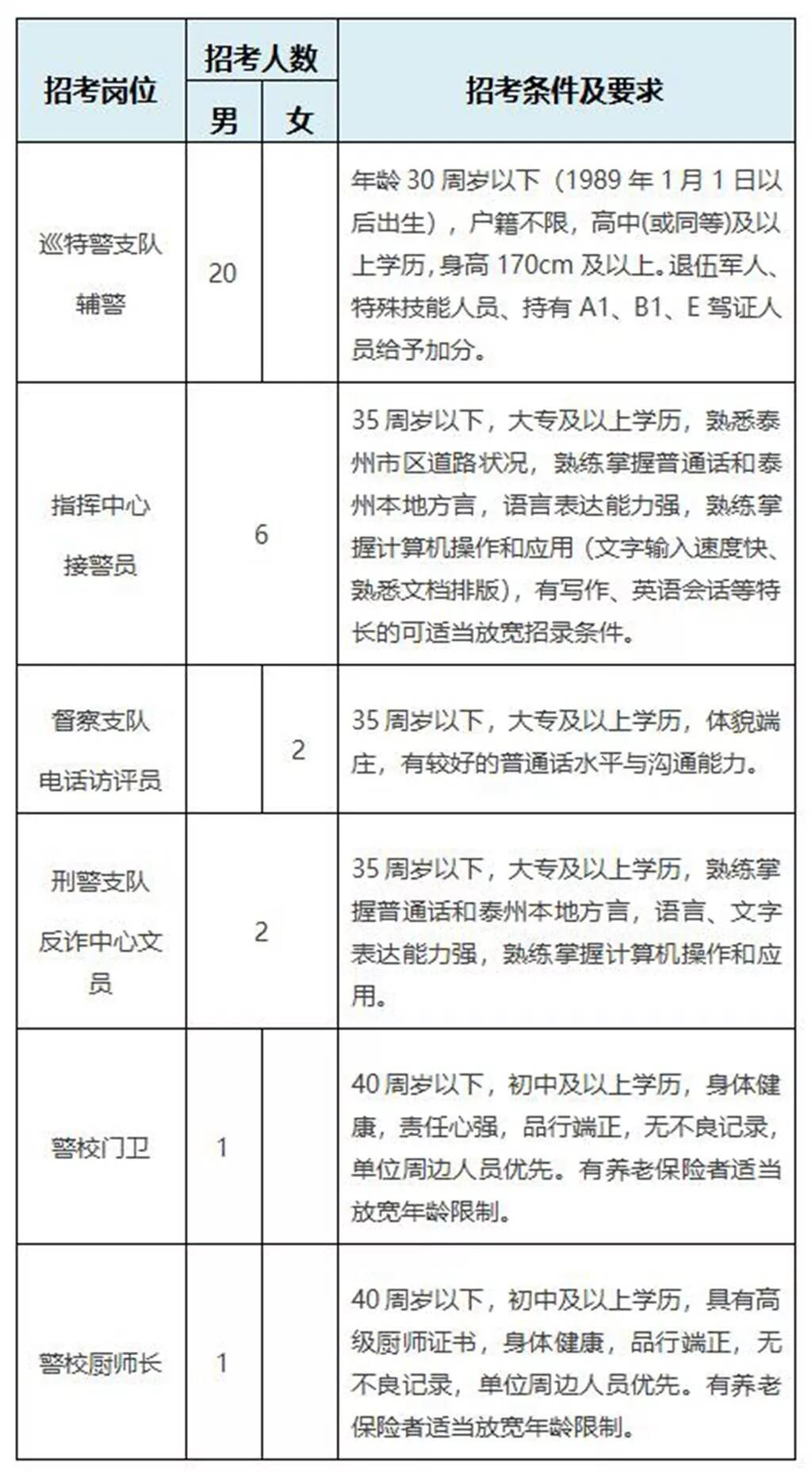 因工作需要,泰州市公安局現(xiàn)面向社會公開招錄警務(wù)輔助人員,有關(guān)事項(xiàng)在泰州人才網(wǎng)公告如下:
