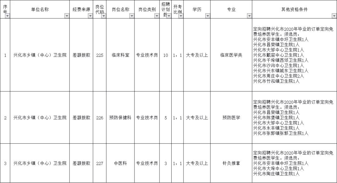 3.興化市鄉(xiāng)鎮(zhèn)(中心)衛(wèi)生院225、226、227崗位,定向招聘興化市2020年應(yīng)屆定向免費(fèi)培養(yǎng)醫(yī)學(xué)生;